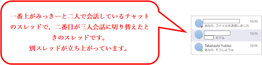 ・会話の途中でメンバーを追加すると別のスレッドとして立ち上がる(二人で会話しているところにもう一人が参加しようとすると、二人の会話スレッドはそのまま残され、新たに三人のスレッドが立ち上がる)。