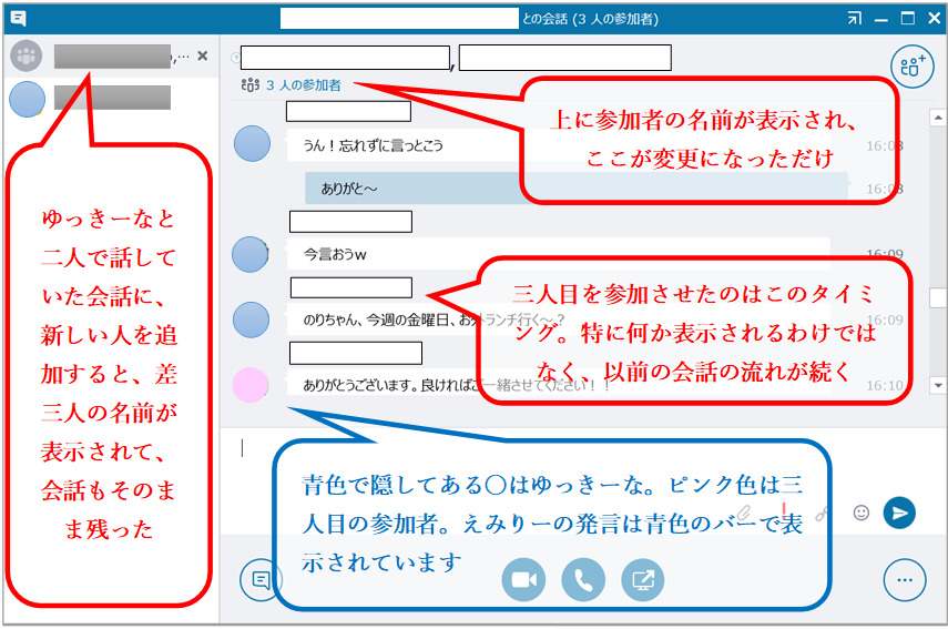 えみりー的には、Skype for Businessの仕様のほうが、さっきまで何を話していたのか、新しい参加者に伝えるときに、わざわざ、二人チャットの画面に切り替えながら「えっとね…さっきはなしてたこれなんだけど…」みたいにもたもたとなってしまうかなと考えたので、一応デメリットとして分類しておきました。