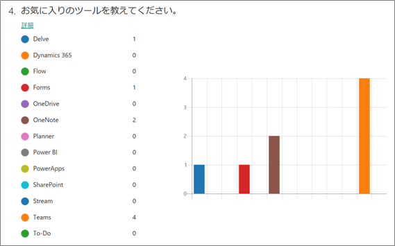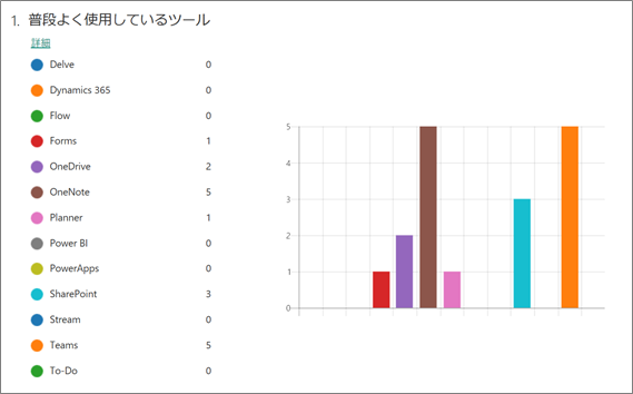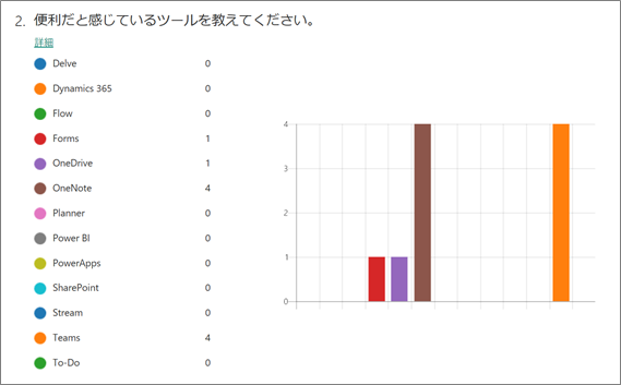 次にOneNoteといったところでしょうか。Formsは総務関係の人に重宝されているようです。日程調整などに使うと便利なようです。実はこのアンケートもFormsで取りました。